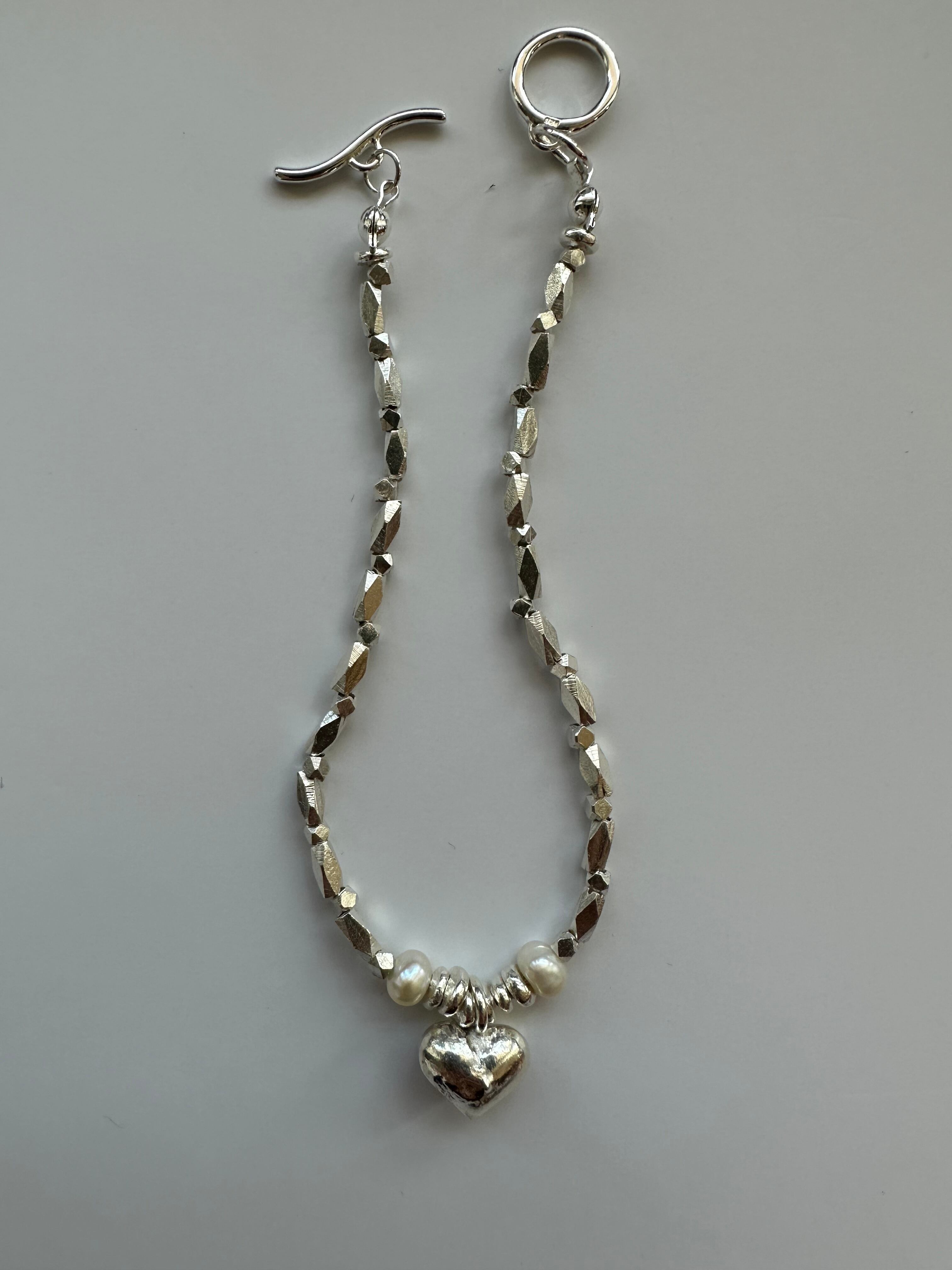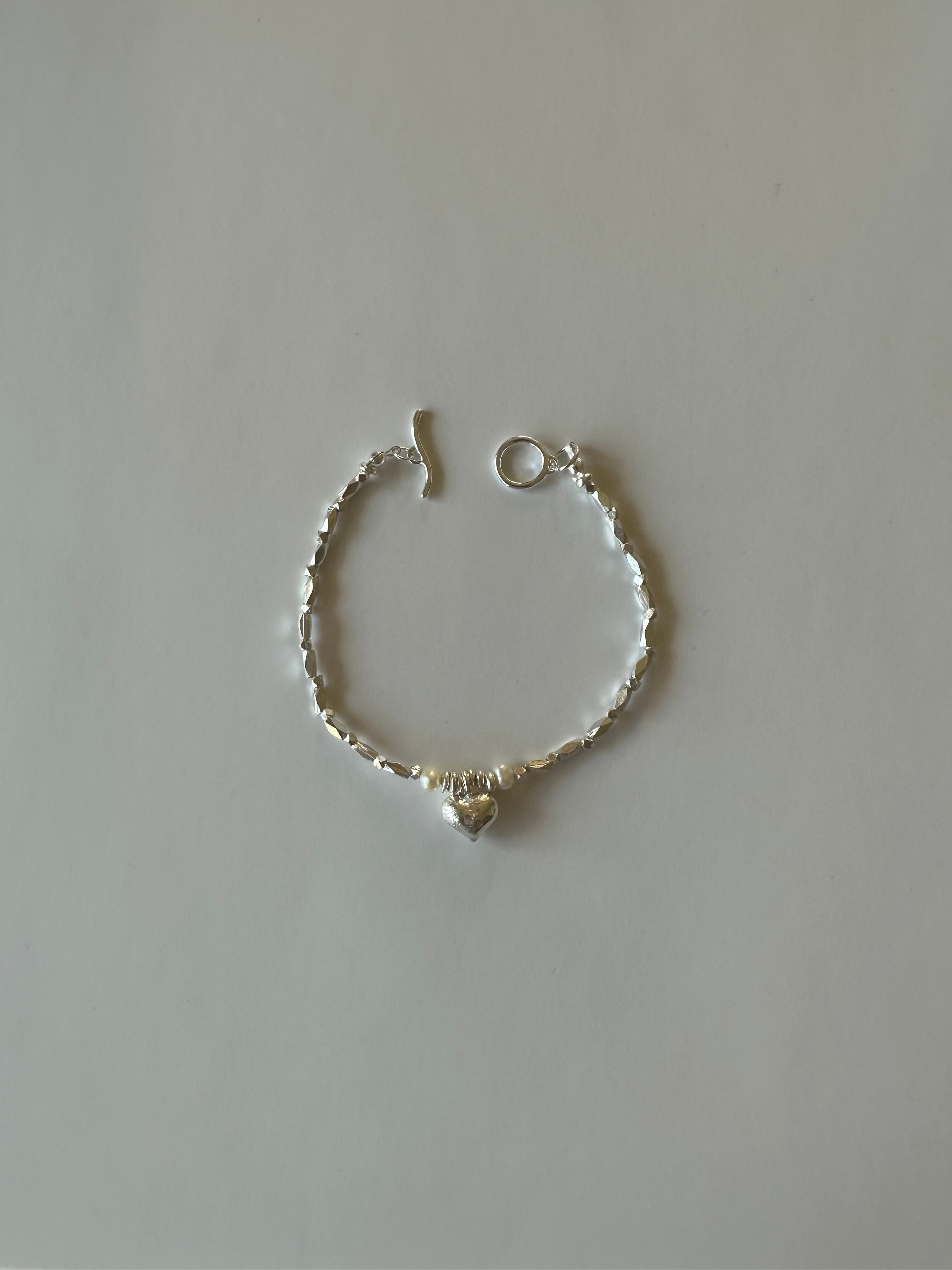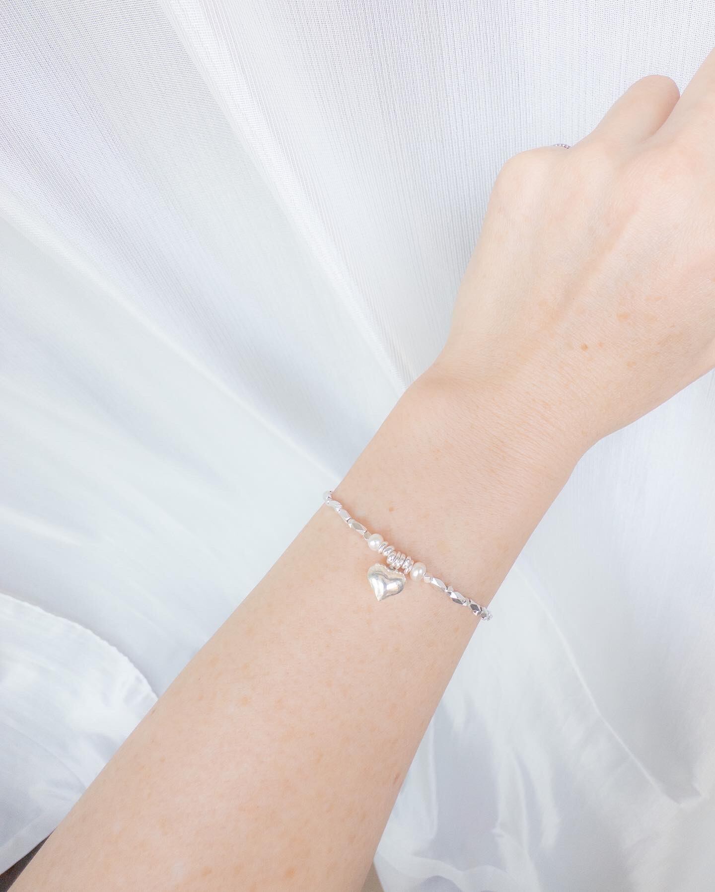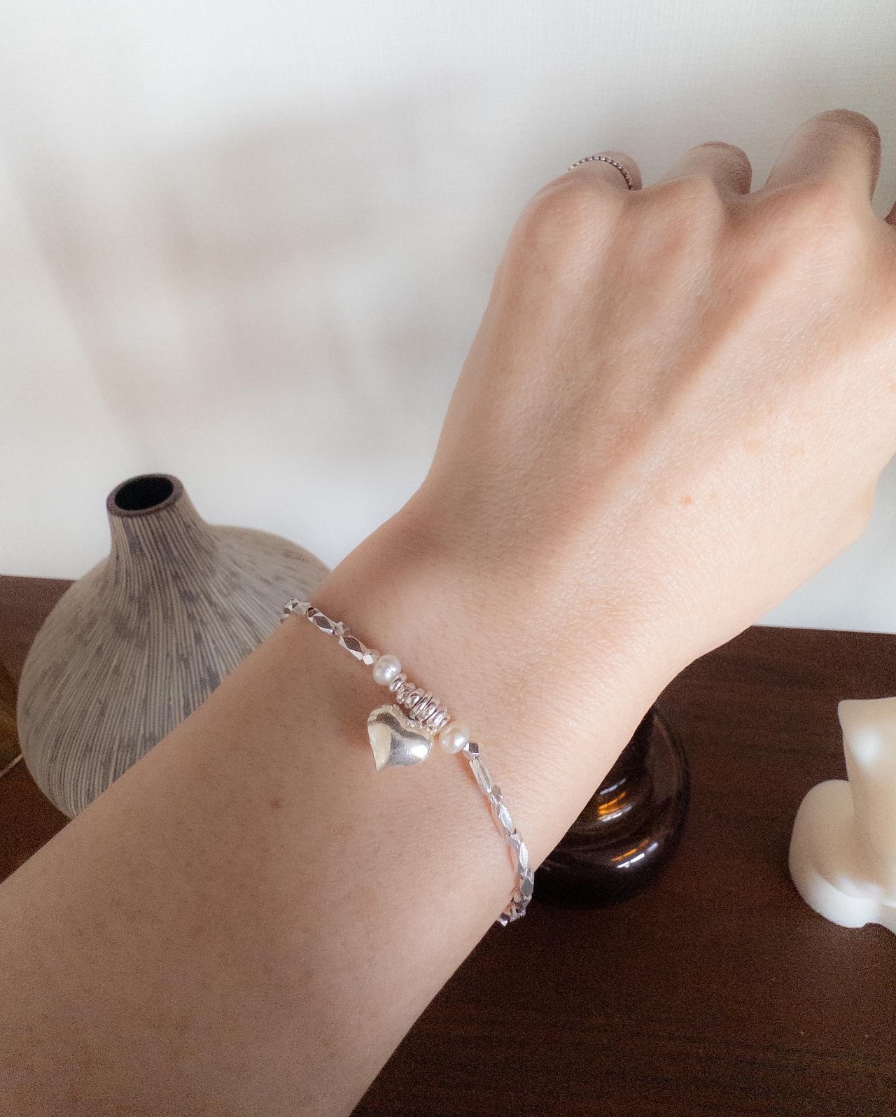 中央にはあたたかみのある ぷっくりしたハートを置き、左右にはパールも!