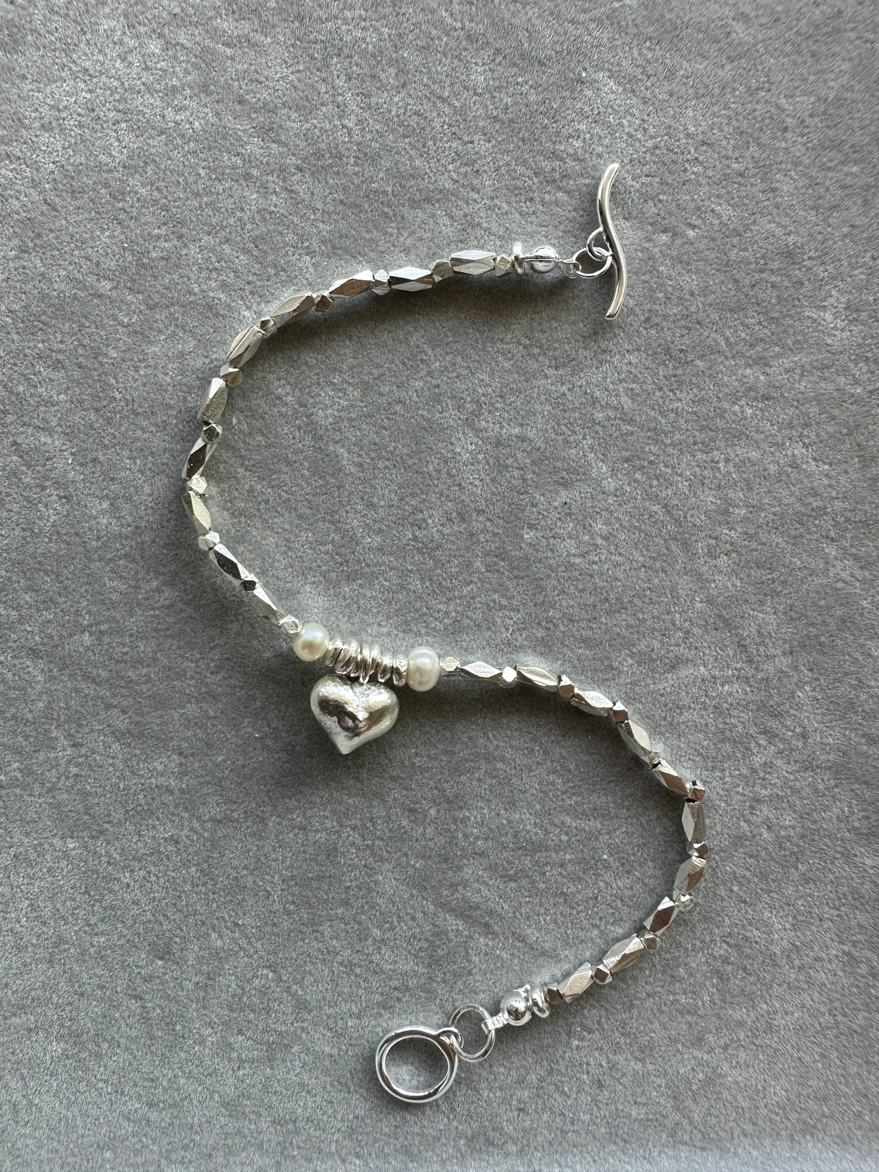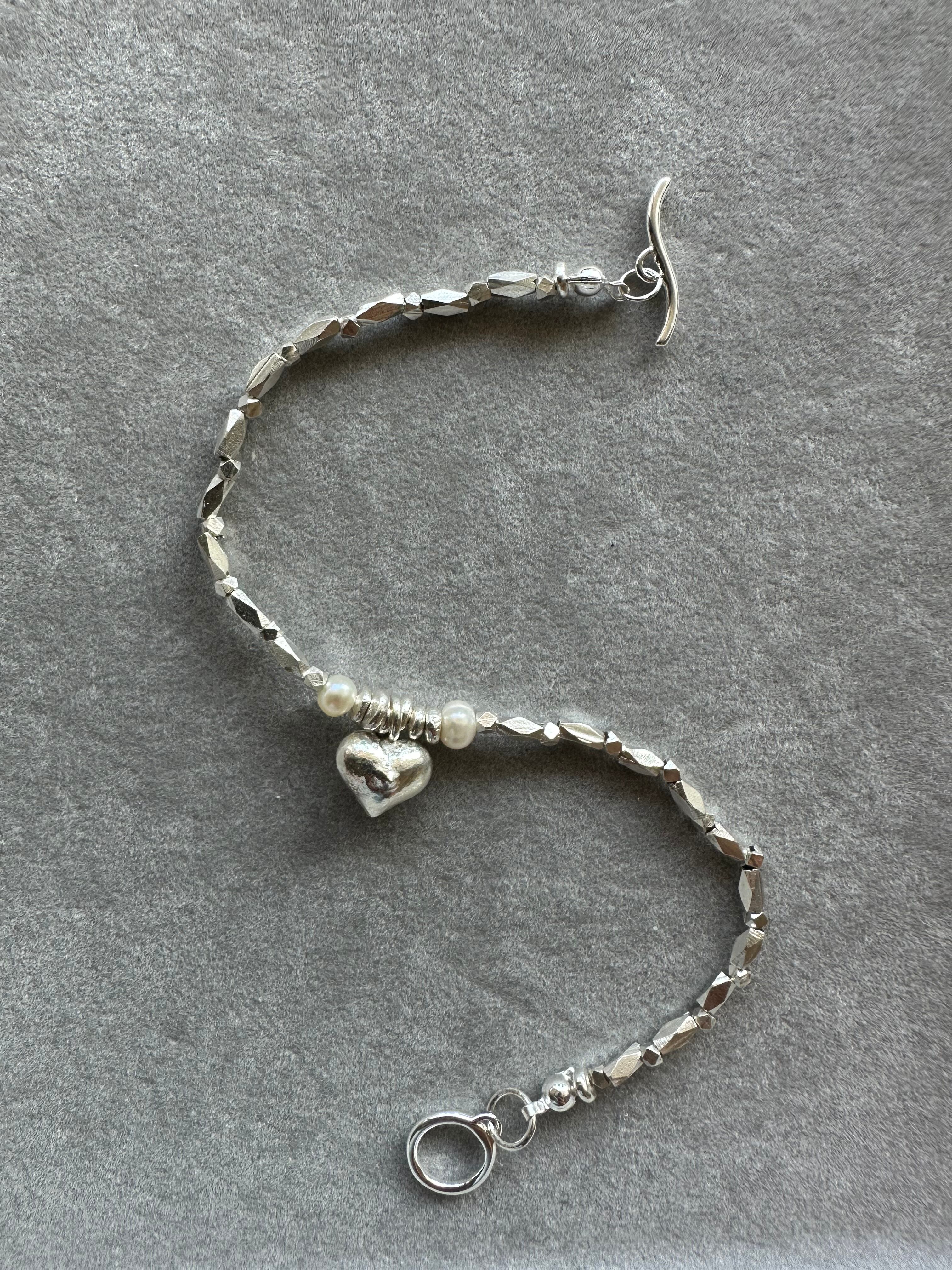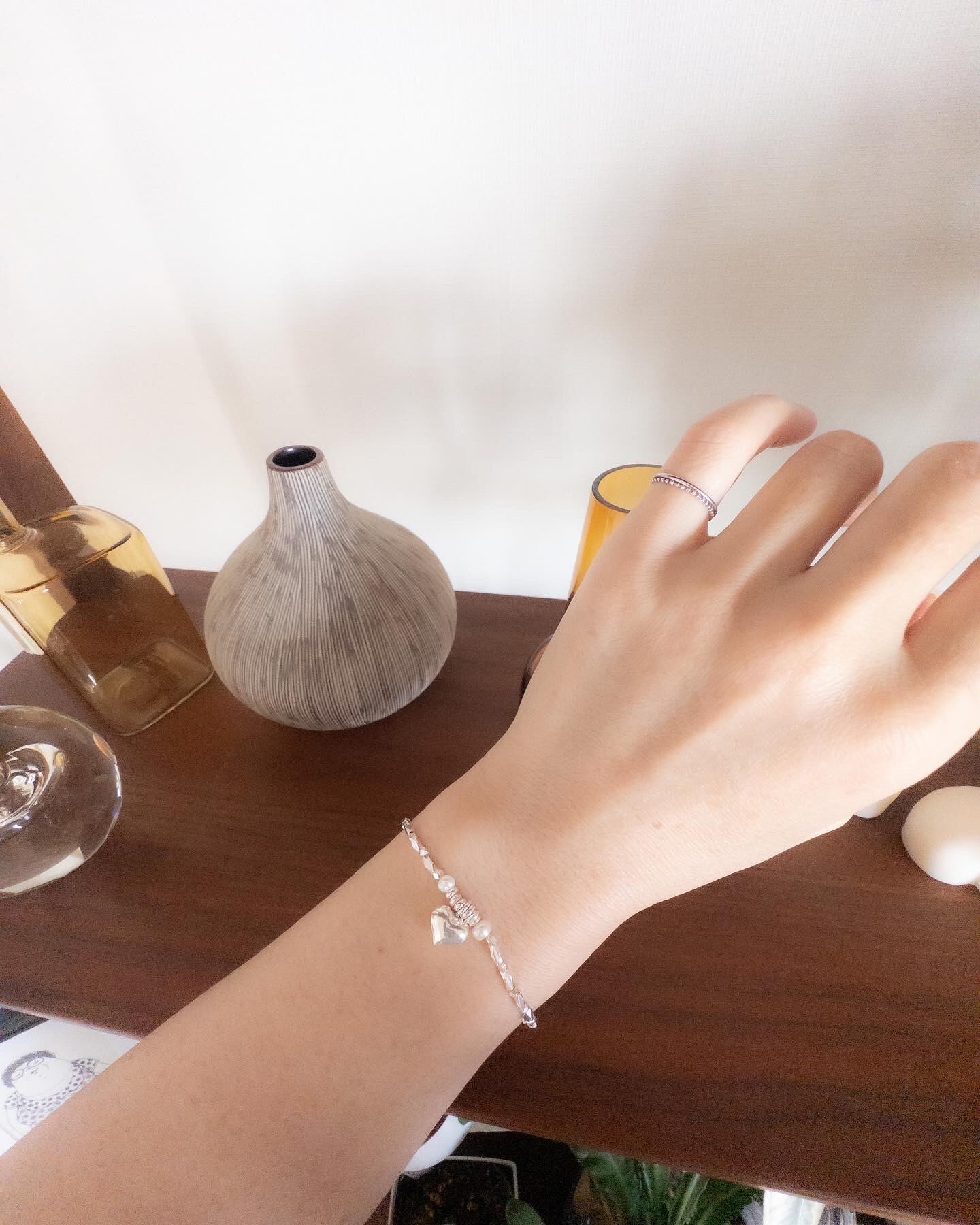 中央にはあたたかみのある ぷっくりしたハートを置き、左右にはパールも!
