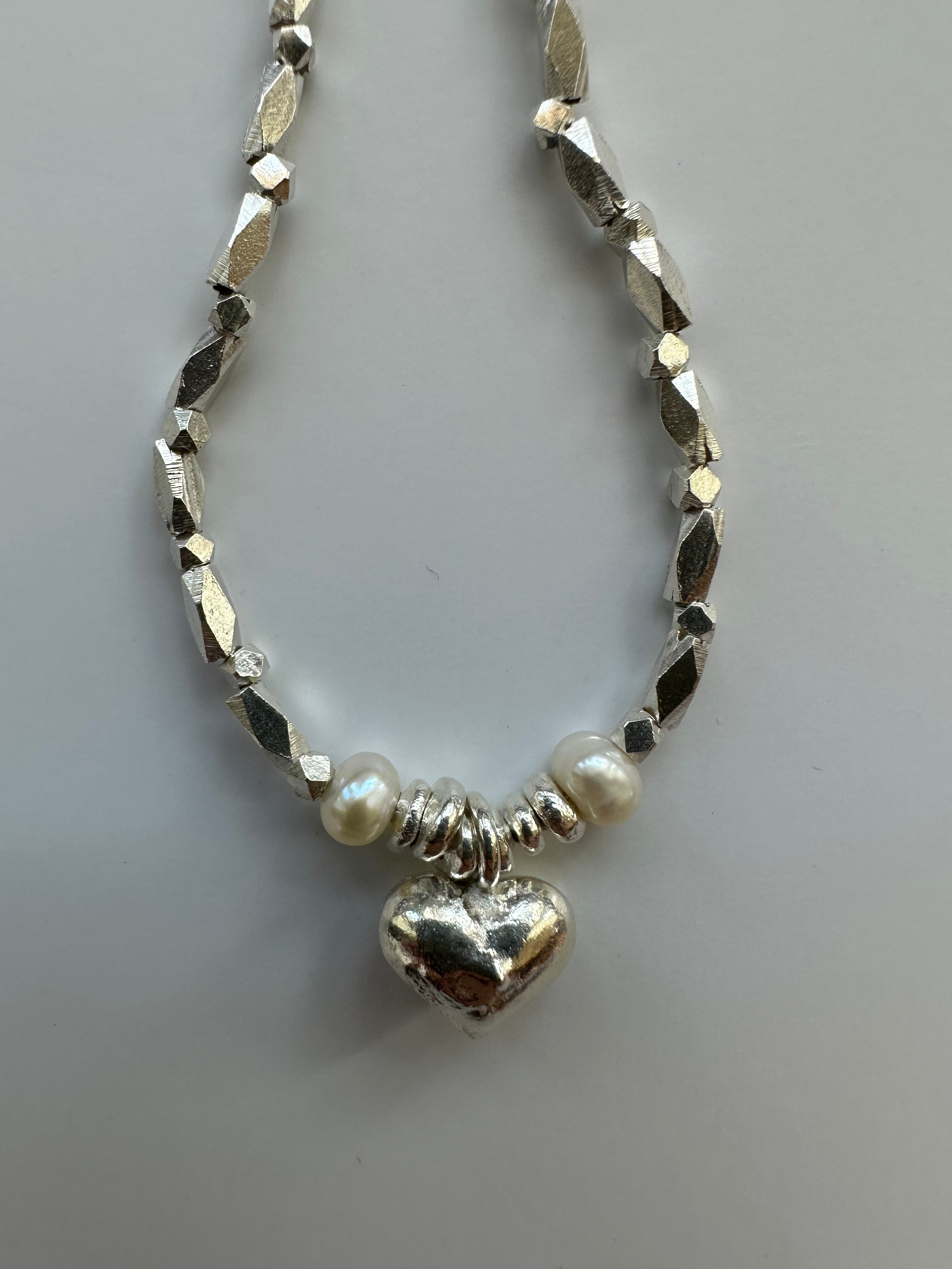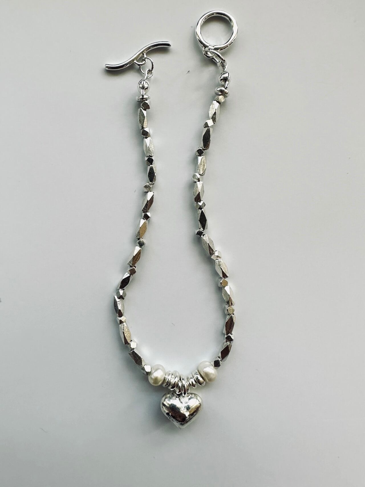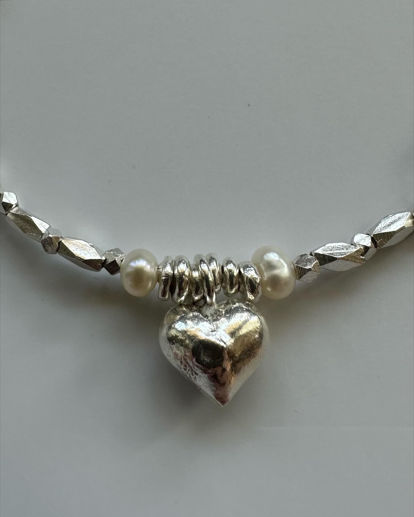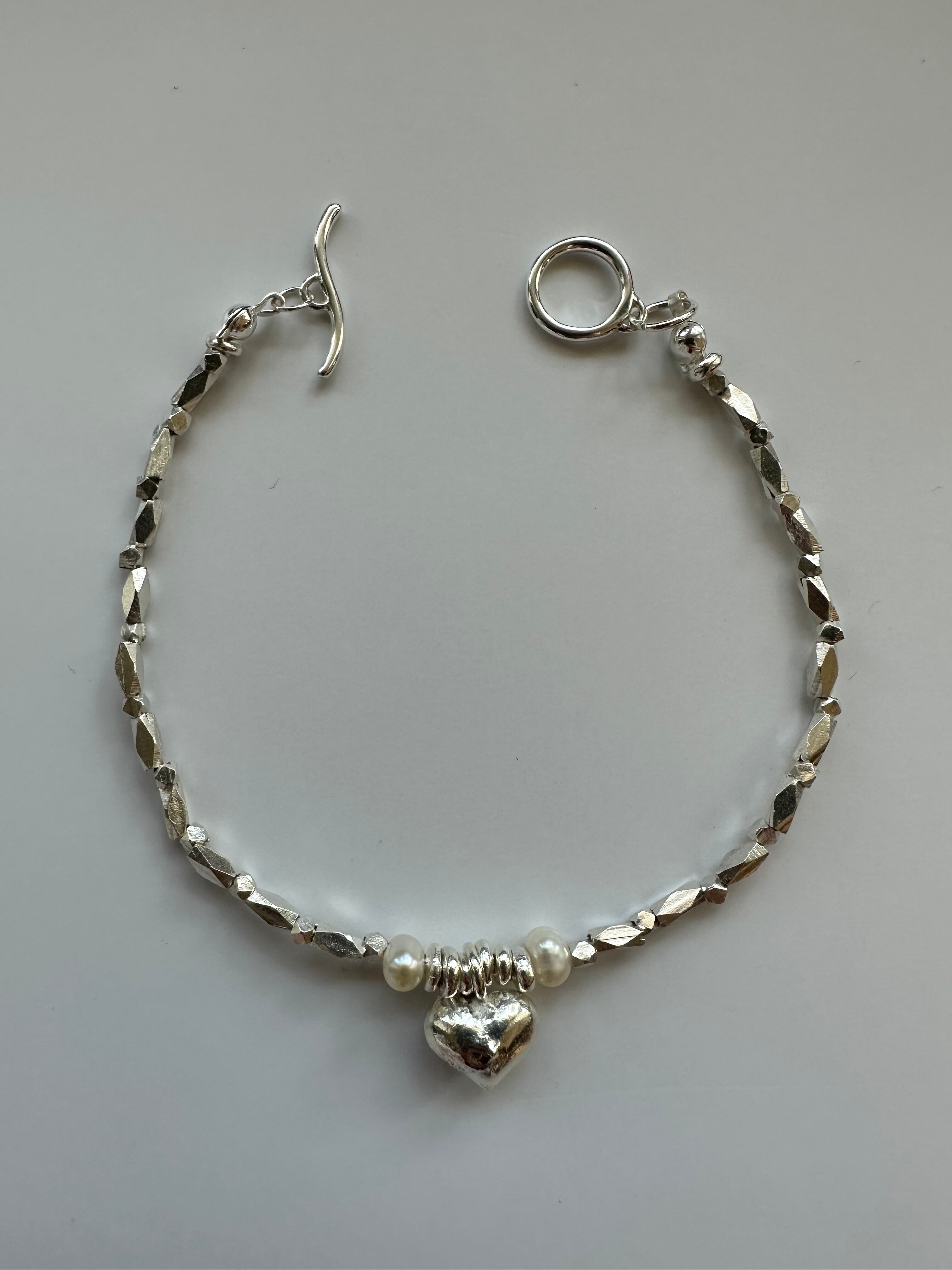中央にはあたたかみのある ぷっくりしたハートを置き、左右にはパールも!